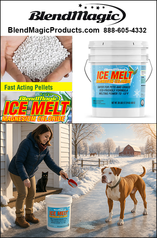 BlendMagic Products understands horse owners need to be especially careful when choosing an ice melt product? When winter weather hits, icy walkways, barn entrances, and driveways become not just inconvenient—but dangerous. Many of us have experienced slipping in the ice or snow when leading our horses— it isn’t fun. Worse yet, is when the horse slips at the entrance of the barn landing on the barn floor! Many common ice melt products contain chemicals that can irritate hooves, burn pet paws, damage surfaces, and even harm surrounding grass or trees. Some are downright dangerous if pets lick their paws or if curious horses explore recently treated areas. That’s where ICE MELT by BlendMagic Pure Magnesium Chloride Pellets come in. This all-natural, powerful ice melt is safe for animals, eco-friendly, and highly effective, even in the coldest conditions. It gives you the confidence to protect your horse property without compromising safety or sustainability.