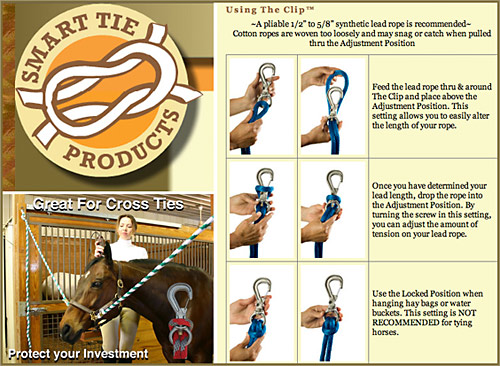 The horse industry is full of gadgets that may be a good idea but are ineffective or impractical for day-to- day use. The Clip is not one of them! I have three Clips in constant use personally and have used the Clip countless times during my clinics to help horses learn to stand confidently rather than pulling back. Thanks for making a truly useful tool with horses.