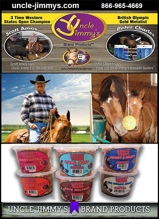 Uncle Jimmy's Brand Products Are you looking for a tasty way to keep your horse entertained and busy during the long hours in the stall? Uncle Jimmy is an active horseman who understands what it takes to keep your horse happy, healthy and enjoying life!